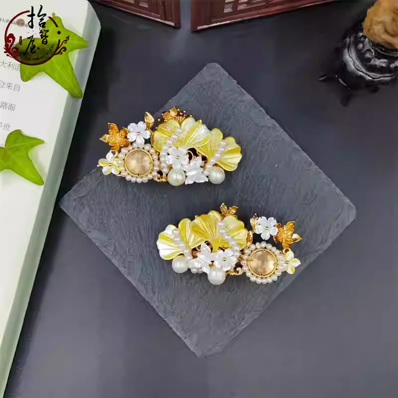 Original design, handmade, a pair of retro pearl hairpins, Hanfu fairy accessories, carefully made of white butterfly shell, yellow butterfly shell, black butterfly shell, natural freshwater pearl, water foam jade and other materials, exquisite and beautiful.