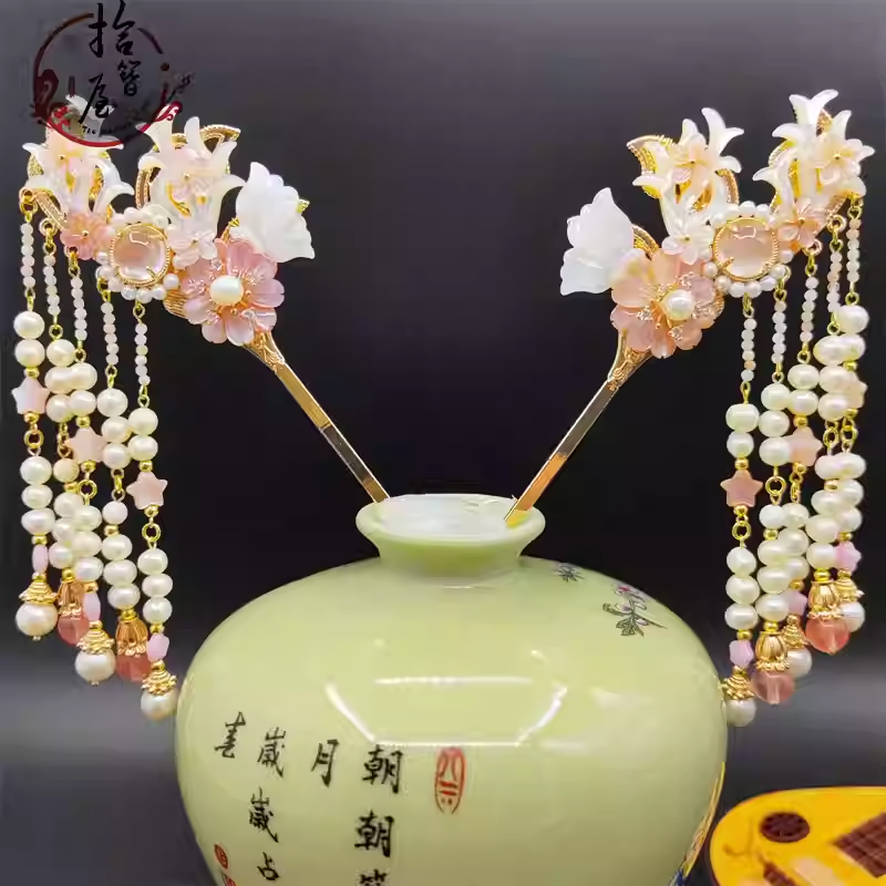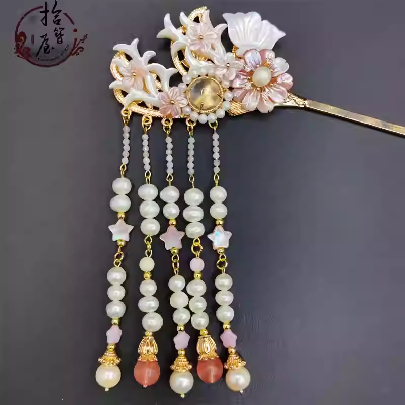 Original design, handmade, retro deer walking, walking, walking belongs to a kind of hairpin. Because the position starts to walk, the pearls on the hairpin will shake with it, so it is called walking. It is made of natural freshwater pearls, white butterfly shells, pink butterfly shells, southern red, water foam jade, zircon, etc.